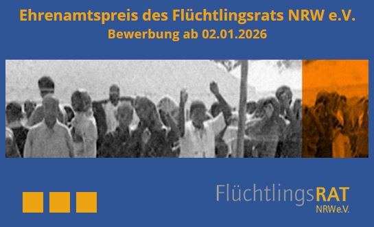 Der Flüchtlingsrat NRW e.V. vergibt im November 2026 zum sechsten Mal seinen Ehrenamtspreis für herausragendes Engagement in der Flüchtlingsarbeit. Gemeinsam mit DGB NRW und Amnesty International werden in der Zeche Carl in Essen Initiativen und Einzelpersonen ausgezeichnet, die sich in besonderer Weise für die Unterstützung und Integration geflüchteter Menschen einsetzen.